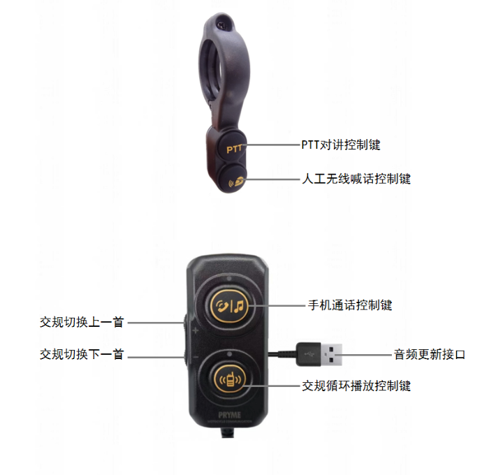 ●双键手柄控制器可控制对讲机PTT通话和车载喊话功能,也可提供含手机无线控制功能版