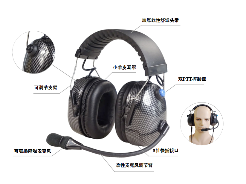 HP70-DC双通道高降噪通讯耳机采用碳素外壳设计,具有双对讲机连接电缆接口和双PTT控制按键